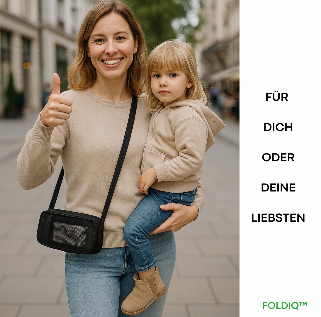 In der Tasche-Form misst Foldiq™ ca. 30 × 25 × 5 cm – etwa wie ein Tablet in einer flachen Umhängetasche. Superleicht und überall verstaubar.