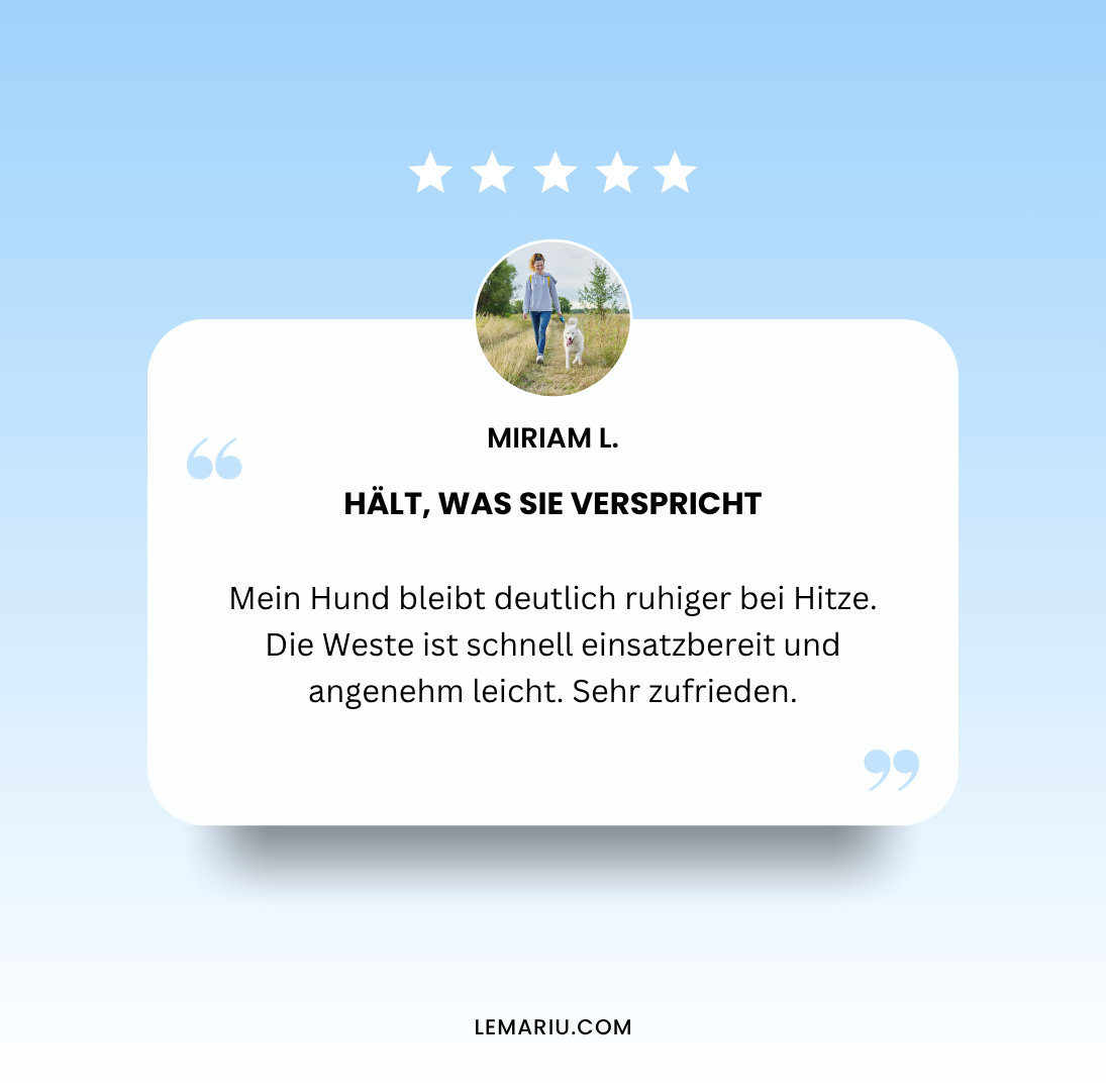 Thomas W. Mai 2025Verifizierter KundeDie Passform ist top, nichts verrutscht. Auch nach längeren Spaziergängen bei 30 Grad ist mein Hund fit und nicht überhitzt.