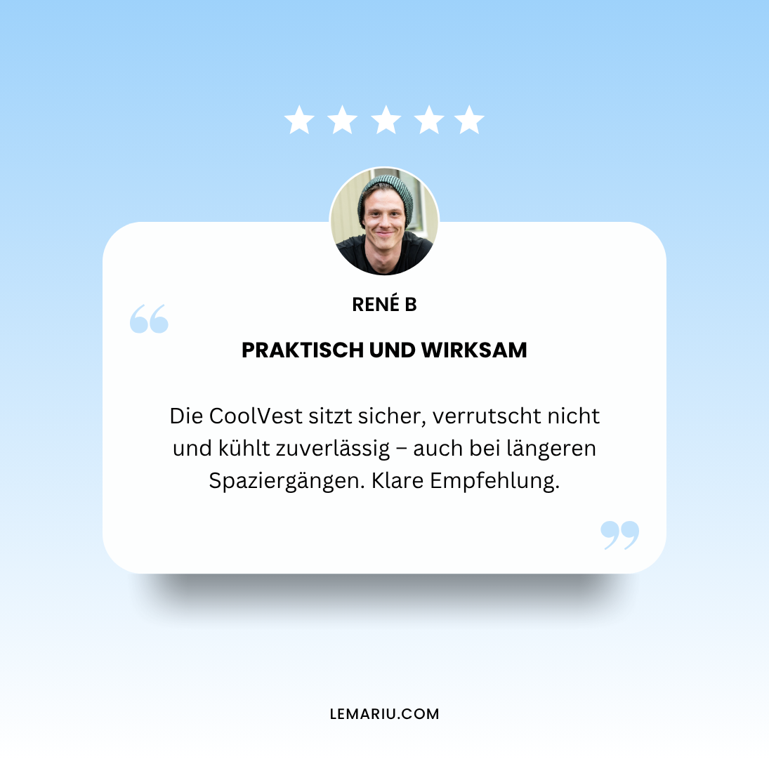 Paul I. April 2025Verifizierter KundeMein Senior leidet unter hohen Temperaturen. Die CoolVest hat sofort geholfen – er wirkt deutlich entspannter und frisst wieder besser.