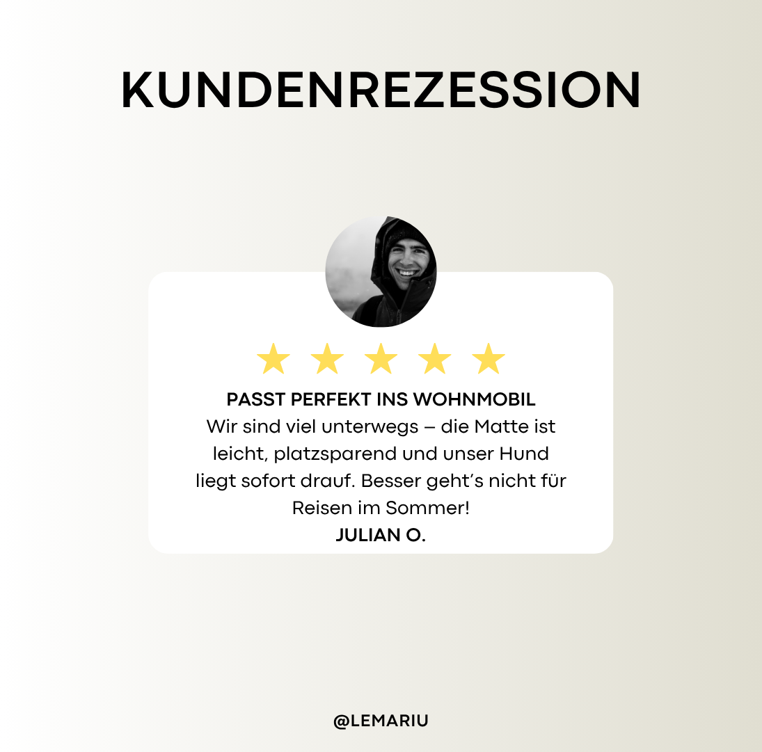 Nadine O. Juni 2025Verifizierter KundeIch habe die kleine Matte fürs Auto gekauft – mein Hund liegt jetzt endlich ruhig bei Fahrten im Sommer. Leicht, faltbar und sehr effektiv!