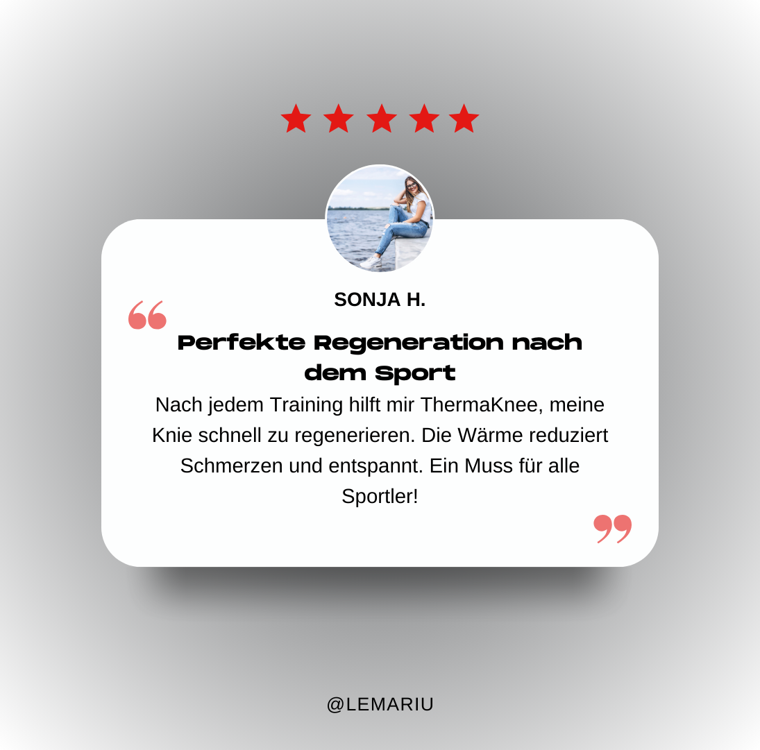 Tina B. Februar 2025Verifizierter KundeIch benutze ThermaKnee nach meinen langen Läufen. Es reduziert die Schmerzen sofort und hilft mir, mich schneller zu erholen. Es ist ein echtes Game-Changer!