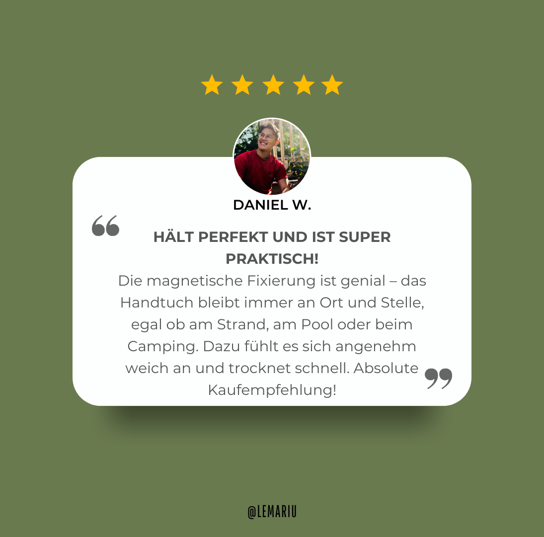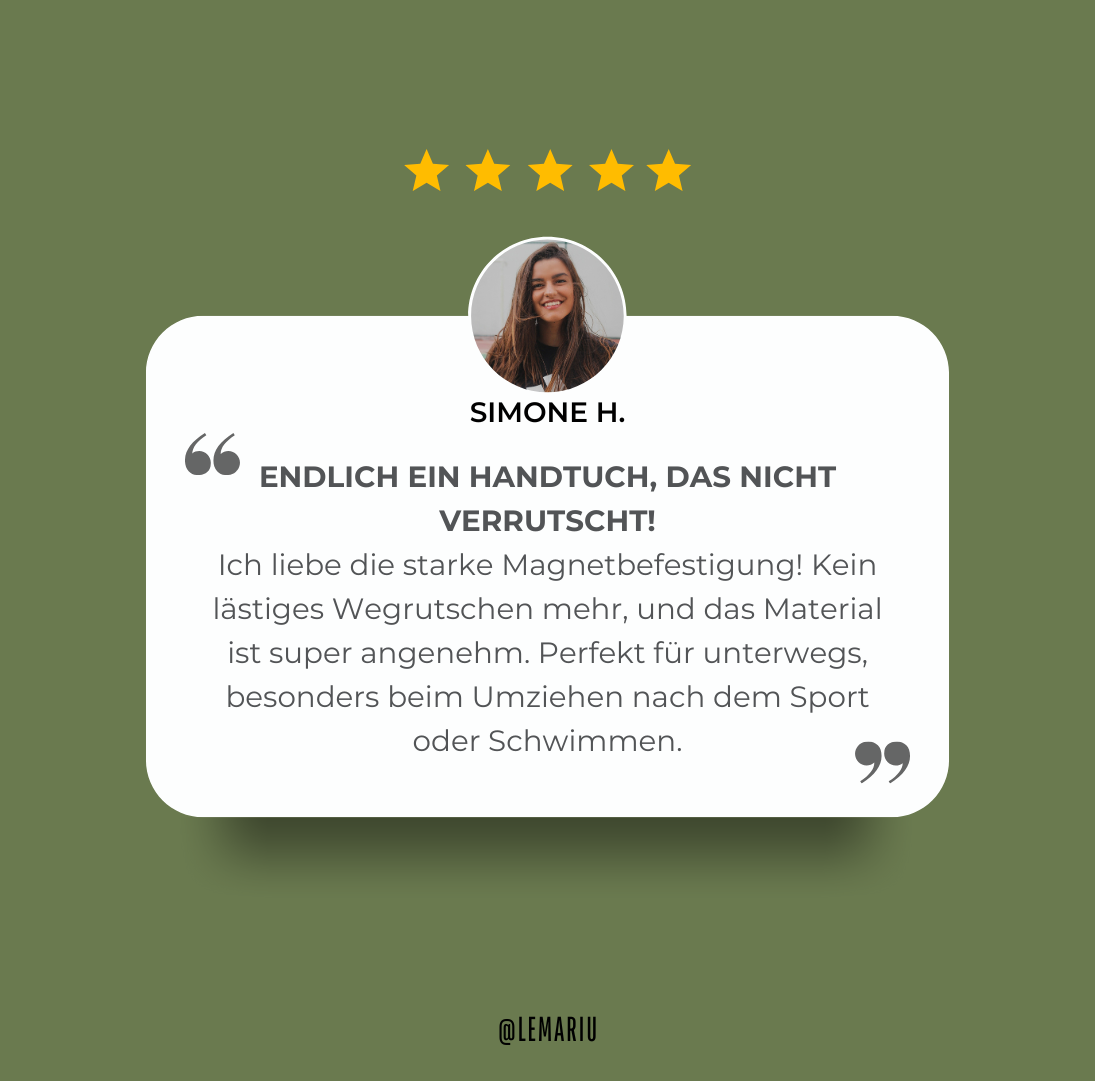 Sina K. März 2025Verifizierter KundeEndlich ein Handtuch, das nicht ständig wegweht! Die magnetischen Ecken sind super praktisch, und das Material fühlt sich angenehm weich an. Perfekt für den Strand oder nach dem Sport.